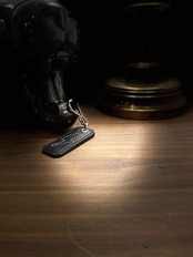 ステッチによる模様を施したタグ。着脱が容易なナスカンが付いています。